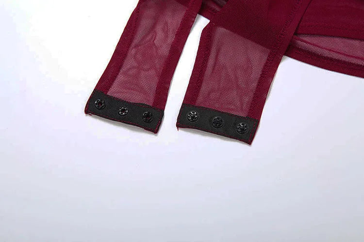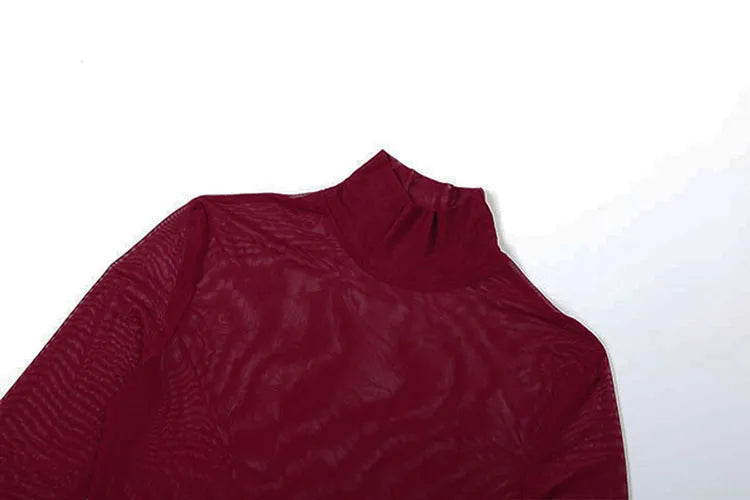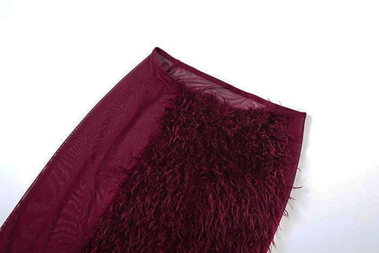 Slim See Through 2 Piece Set Woman Turtleneck Full Sleeve Bodysuits+Furry Patchwork High Splits Skirts Sexy Mesh Outfits