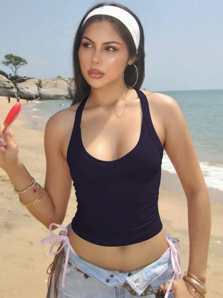 Solid Color Ribbed Knitted Tanks & Camis Low Cut Backless Halter Tops for Woman Basic Summer Crop Top