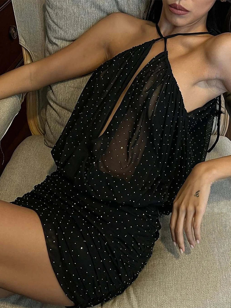 Speckled Sequins Dress Women See Through Backless Sleeveless Solid Pleated Patchwork Midnight Clubwear Party Bodycon