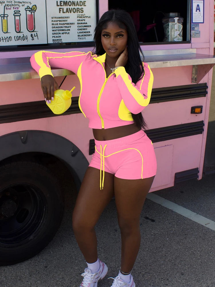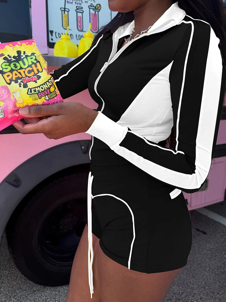 Sporty Contrast Patchwork Two Piece Set Women Zip Cardigan Turtleneck Crop Jacket+Drawstring Shorts Daily Casual Suits