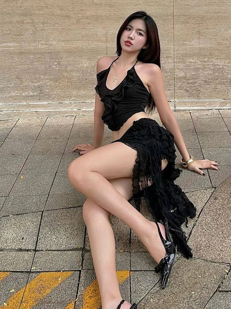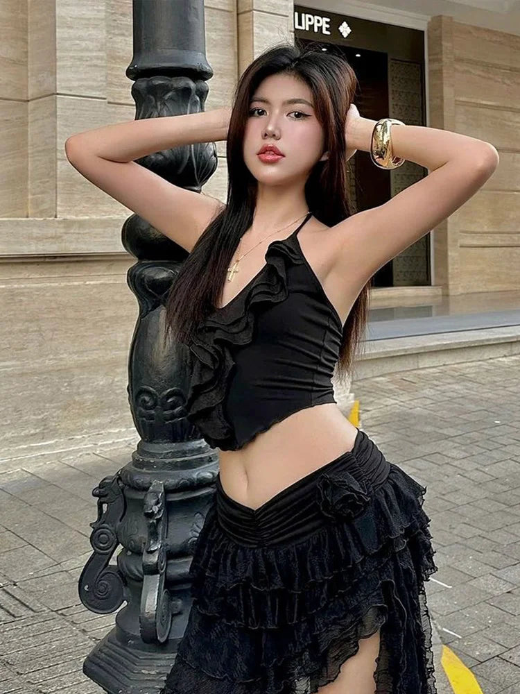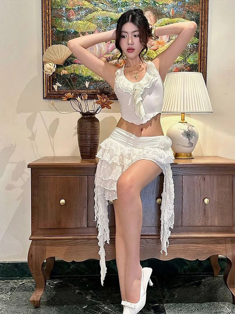 Summer 2 Piece Set Women Y2K Trend Chic Lace-Up Low-Neck Tierred Lace Collarmini Tops+Tassel Skirt Irregular Hem Suit