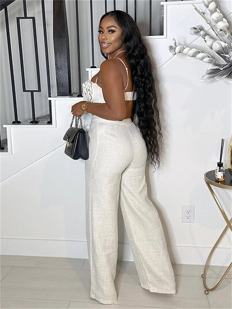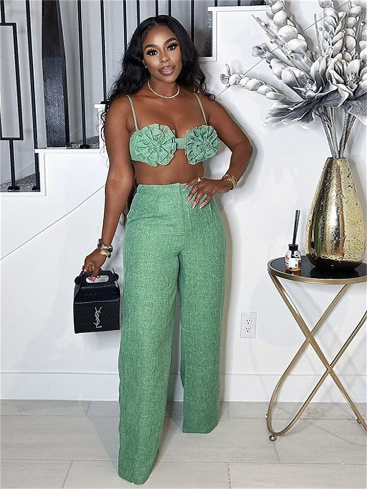 Vacation Beach Style 2 Piece Set Women Ruched Flower Bra Tops+Button Waist Straight Pants Fashion Sexy Trend Outfits