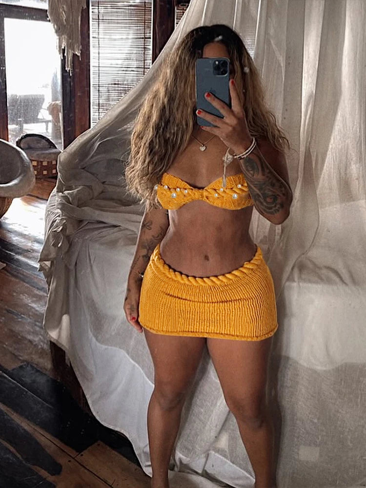 Vacation Women 2 Piece Set Summer Pearl Plait Halter Shirring Camisole+Zip Peach Hip Skirts Matching Crochet Clubwear