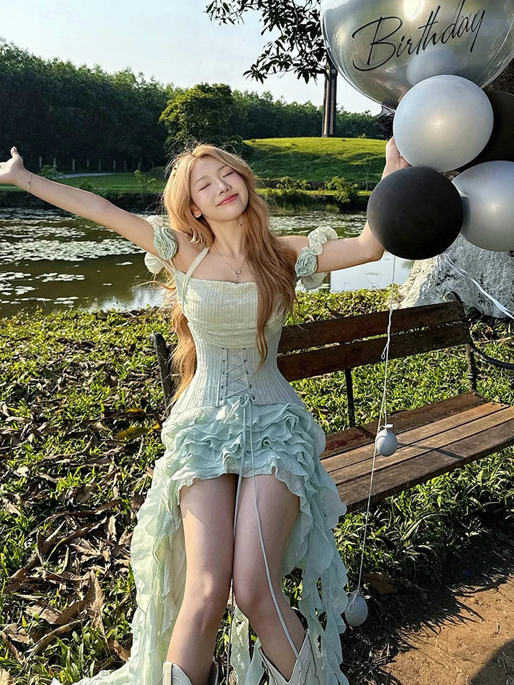 Y2K 3d Flowers 2-Piece Set Women Chic Gradient Cross Bandage Waist Seal+Halter Tassel Tierred Dress Matching Clubwear